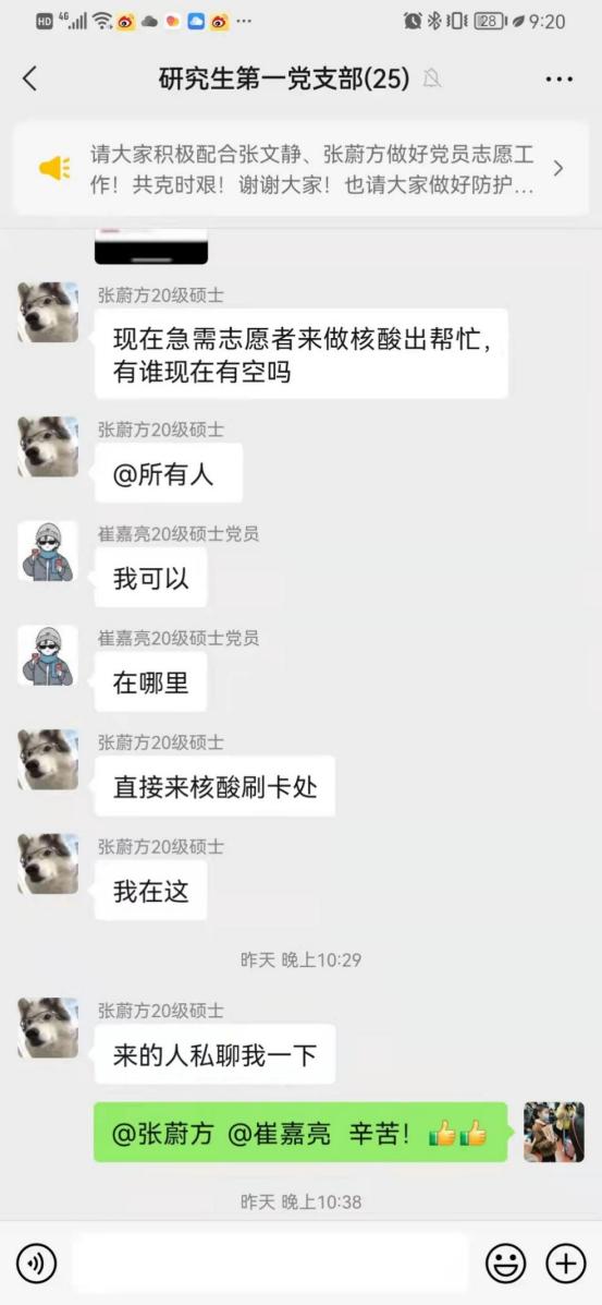 面对上海疫情形势的严峻复杂,张蔚方作为一名研究生党员,在公司疫情防控工作中,主动担当防疫志愿者,冲锋在前。在服务工作中,他逐户统计学院员工三餐订餐情况,汇总后上报学院老师;实时带领支部党员志愿者做好领餐、分发等管理工作,当出现多餐少餐的情况时,及时联系楼层负责人,既做到不浪费粮食,也不让订餐同学无饭领,并在进行全员核酸检测时协助志愿者,保证核酸检测有序进行。除自身身体力行冲在第一线之外,他还积极发动支部党员、发展对象和积极分子参加志愿行动中来。支部党员郁宗飞、崔桂艳、崔嘉亮、吴坤、张泽群、王天宇、刘文海、陈亚峰、赵明钰、高武迪,入党积极分子岳修平等在他的带动下纷纷加入疫情防控志愿者队伍中。
