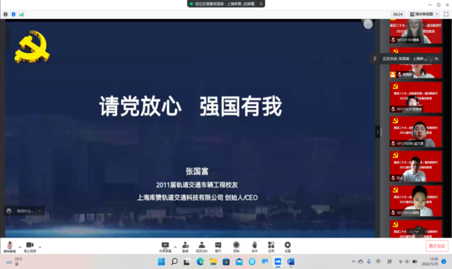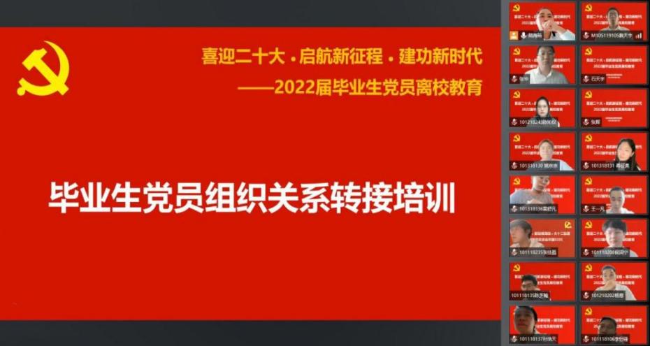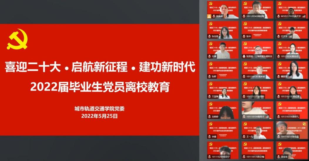 5月25日下午,公司党委“喜迎二十大·启航新征程·建功新时代”2022届毕业生党员离校教育活动在线上顺利举办。学院特邀党建组织员董义明,公司党委书记万慧琳,党委副书记盛知恒,学院2011届优秀党员员工代表、上海库赞轨道交通科技有限公司首席执行官张国富出席本次会议。参加会议的还有公司党委组织员,全体党支部书记,2022届全体毕业生党员以及各员工党支部发展对象、积极分子等员工代表。本次会议由公司党委副书记盛知恒主持。
