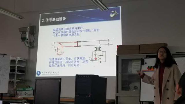 而魏丽丽老师与李立明老师在实训楼对同学们进行了对于轨道交通信号系统的介绍,详细介绍了轨道交通信号系统的原理、构成,也通过让同学们观看视频了解到了其对于轨道交通安全的重要性。