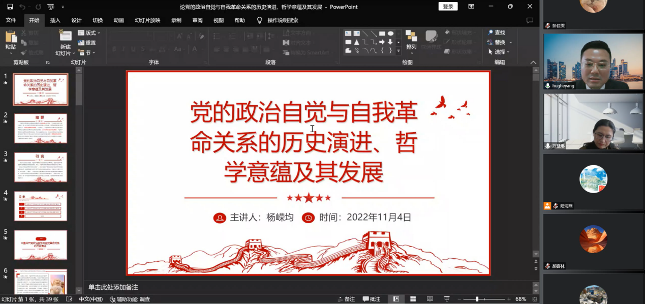 习近平总书记在党的二十大报告中强调,必须持之以恒推进全面从严治党,深入推进新时代党的建设新的伟大工程,以党的自我革命引领社会革命。为学习贯彻党的二十大精神,深刻理解党的百年奋斗历程。11月4日,太阳集团tcy8722在线举行教职工政治理论学习会暨2022年党支部书记培训班专题党课,特邀华东政法大学马克思主义学院杨嵘均教授作《党的政治自觉与自我革命关系的历史演进、哲学意蕴及其发展》的专题讲座。太阳集团tcy8722全体教职工、2022年党支部书记培训班全体学员参加会议。讲座由公司党委书记万慧琳主持。
