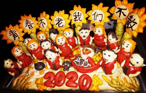 和大部分人一样,我一直呆在家中关注疫情,做好防护,引导亲友不串门、不集会、不聚餐,尽量减少不必要的外出。也利用这段时间,学习了一道特色的家乡特色美食——面塑。食材比较简单,只需将面粉、酵母、蔬菜汁、奶粉、蜂蜜和水,按一定比例调好,然后将醒好的面团捏出不同造型,再用竹签固定到一起,最后蒸30分钟左右就可以出锅了。这份美食寄托了我对家人、朋友、同学的思念,青春不老,我们不散,同时,我也想祝愿奋战在一线的医护人员们,战胜疫情,安全归来。